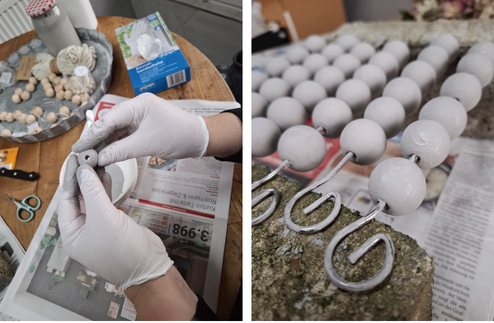 So habe ich mir Einweg-Handschuhe angezogen, etwas graue Kreidefarbe in die Handflächen getan und die Holzkugeln damit eingerieben (nicht zu ordentlich, es soll ja rustikal aussehen :-)