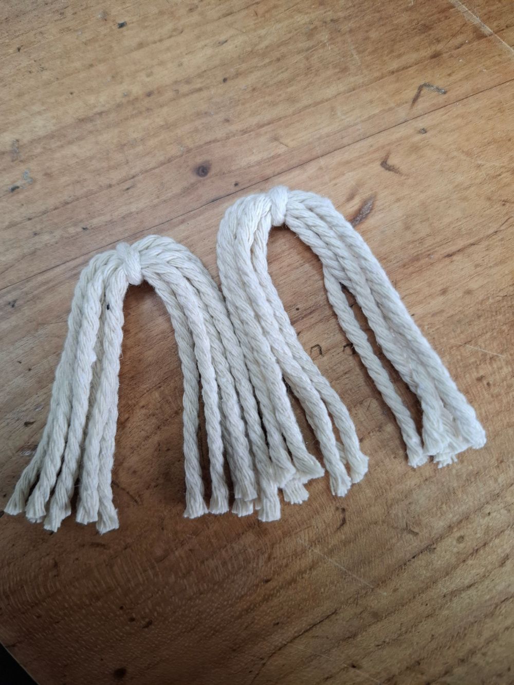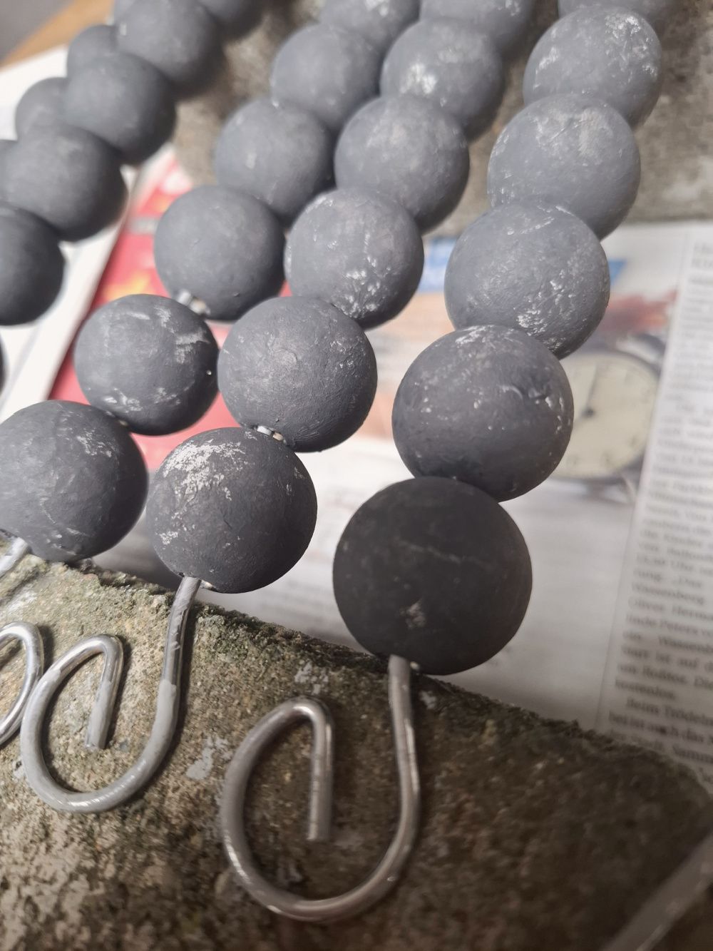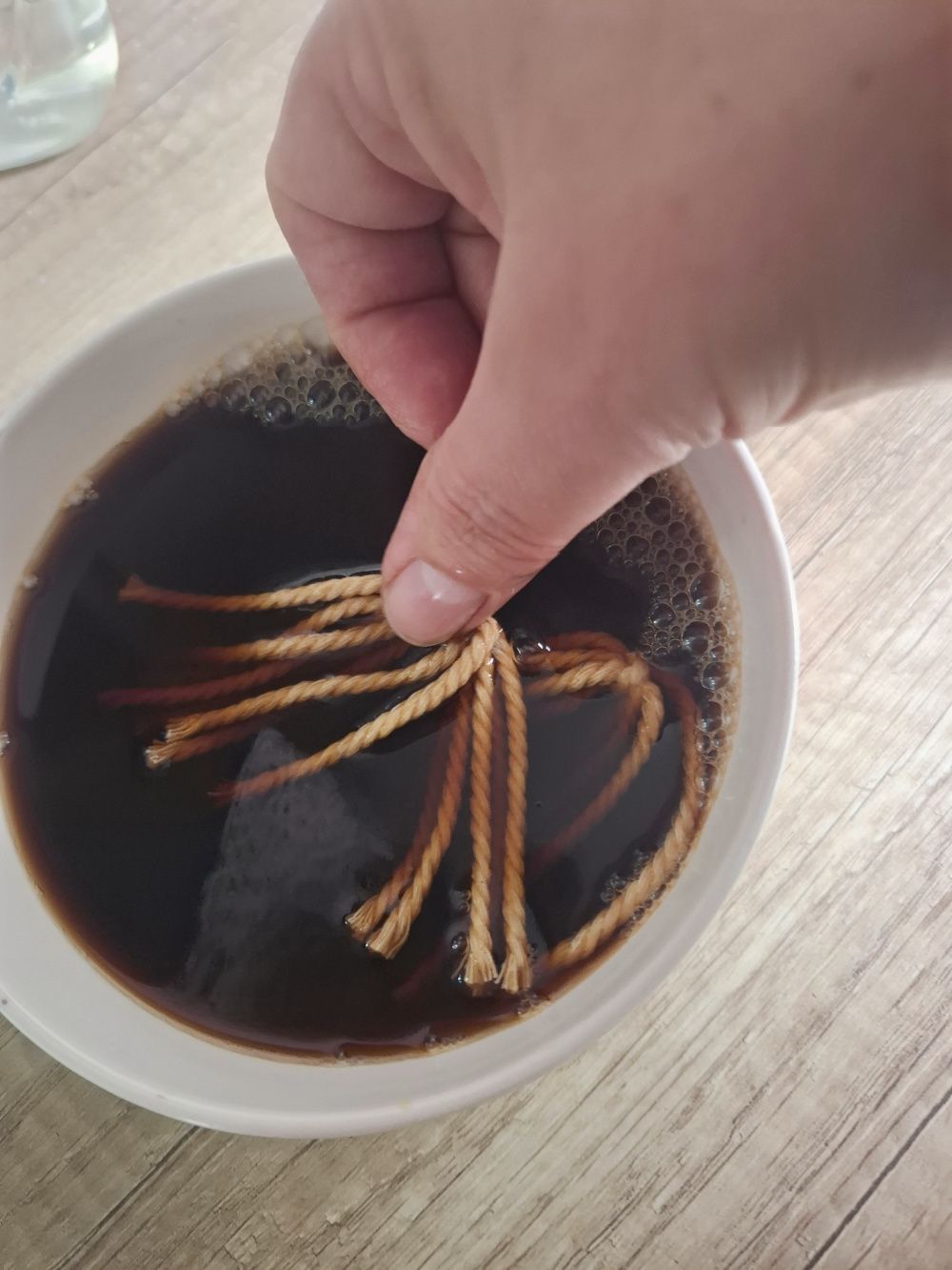 Am nächsten Tag habe ich die Kugeln nochmal sehr grob mit einem dunkleren Grauton betupft, so dass an manchen Stellen der hellere Ton noch etwas hervorscheint. Während der zweite Färbegang getrocknet ist, habe ich das Makrameegarn schonmal vorbereitet und die zwei "Puschel" für die Enden der Kette gewerkelt. Mir war dann allerdings das Garn doch etwas zu hell, so dass ich es kurzerhand mit etwas Kaffee eingefärbt habe.