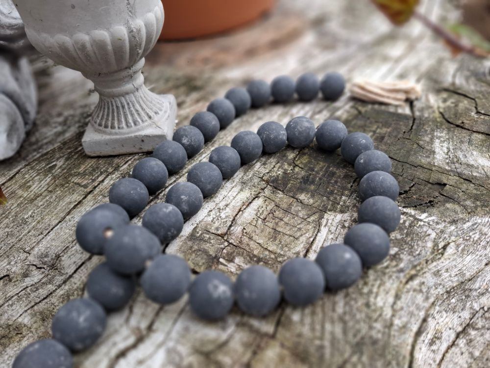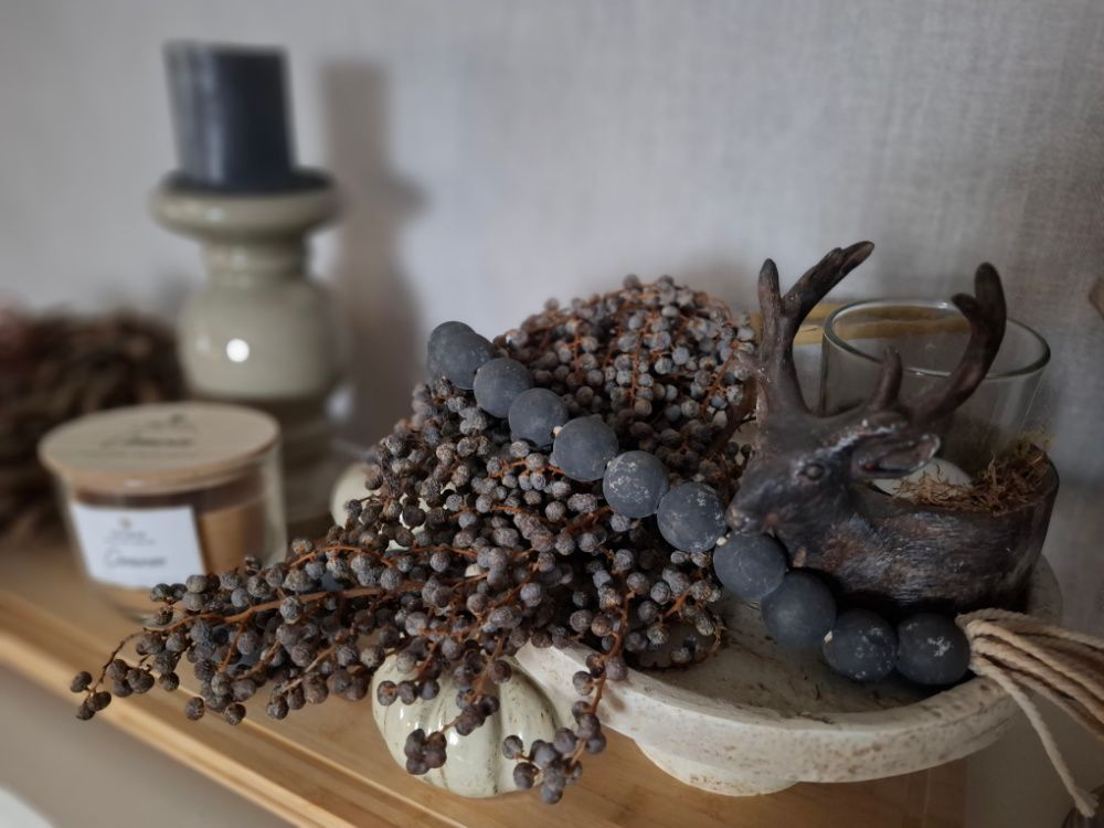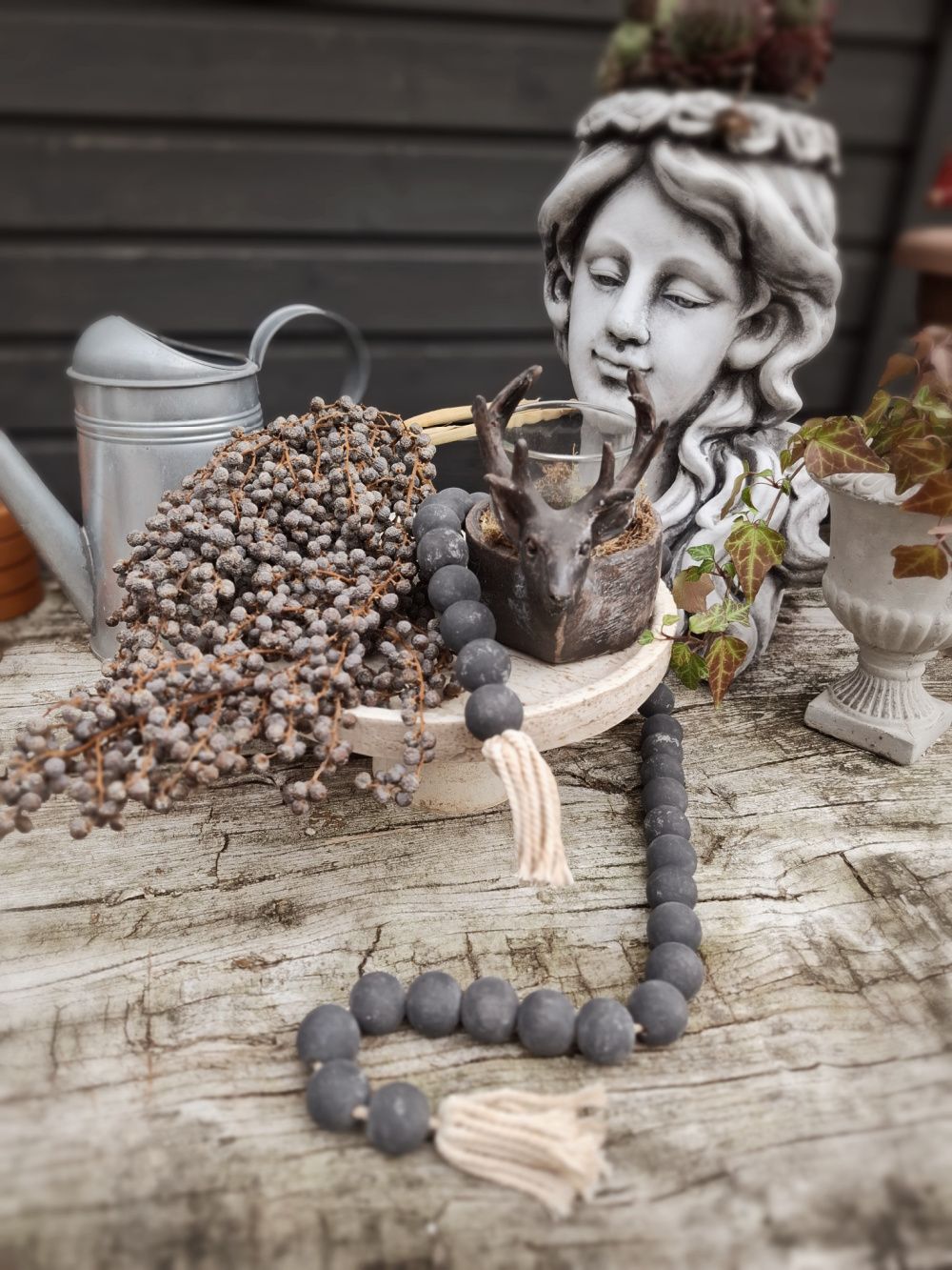 Seit einigen Jahren sieht man in vielen niederländischen Wohn- & Dekoshops immer wieder diese schönen, sehr rustikalen Holzperlenketten. Dekoriert werden sie oft auf großen verwitterten Holztabletts oder über steinernde Schalen drapiert - gerne zwischen Windlichtern und getrockneten Beerenzweigen.