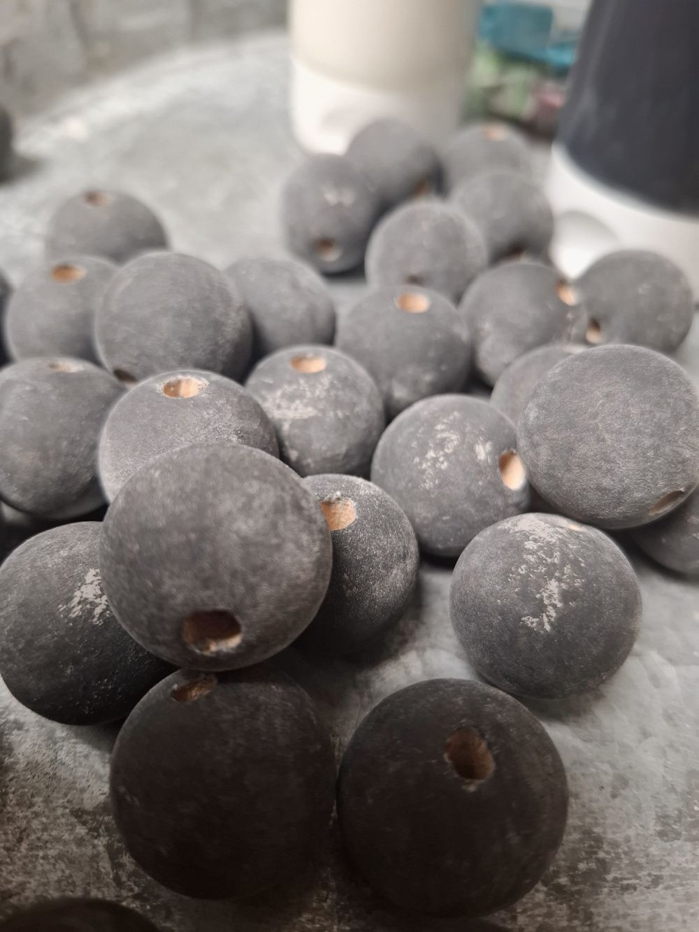Zwei Backsteine auf den Tisch - dazwischen lange Schaschlikstäbchen gelegt - konnten die Holzkugeln darauf aufgefädelt schön durchtrocknen, ohne sich gegenseitig zu berühren.
